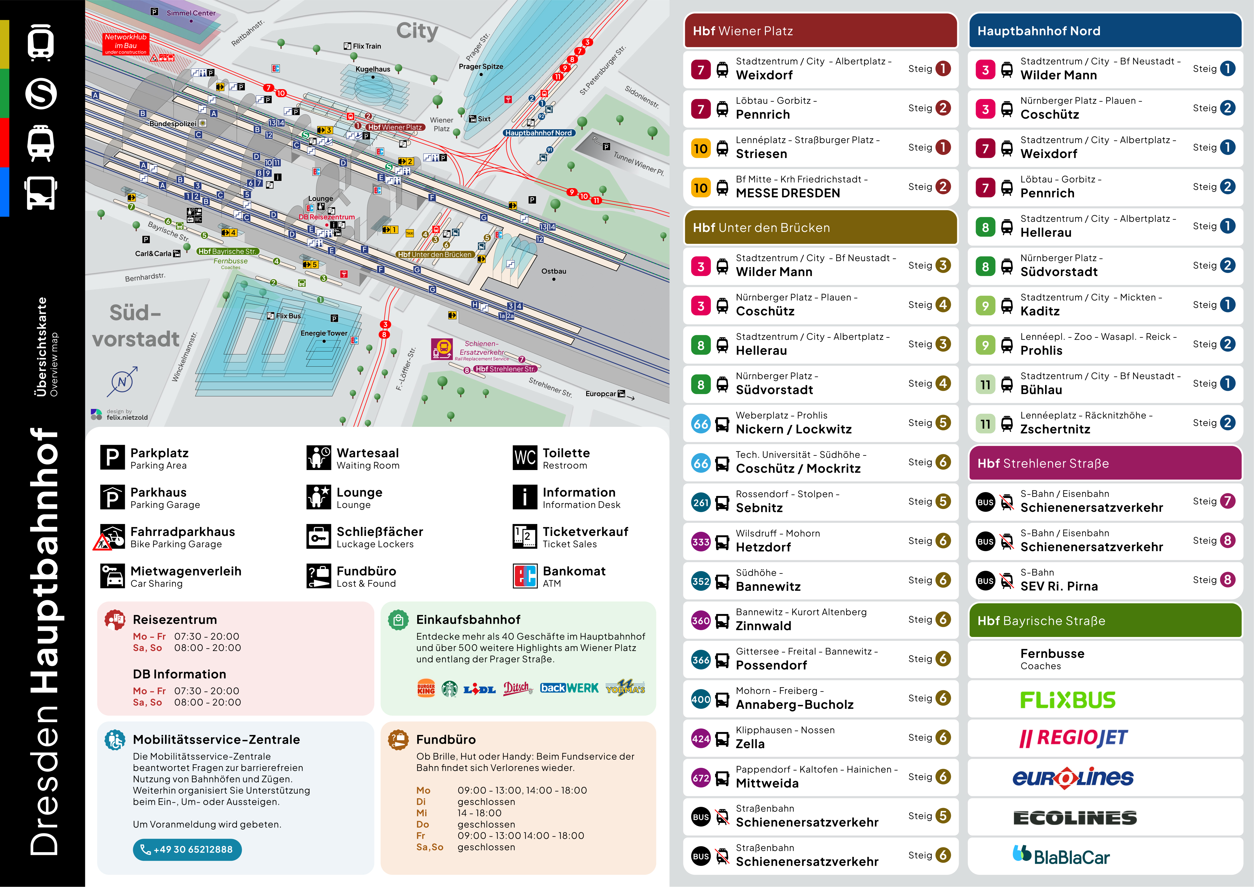 Ein frischer Blick auf den Übersichtsplan des Hauptbahnhofs mit klar strukturierter Linienführung und moderner Farbgebung. Die Aufteilung in unterschiedliche Bereichsblöcke sorgt für sofortige Orientierung. Icons für Service- und Mobilitätselemente ergänzen das Layout mit Nutzwert.